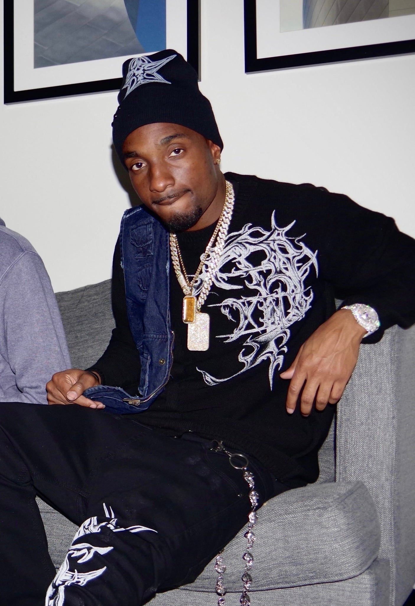Hand cut and sewn sweater with white kill sigilism print.